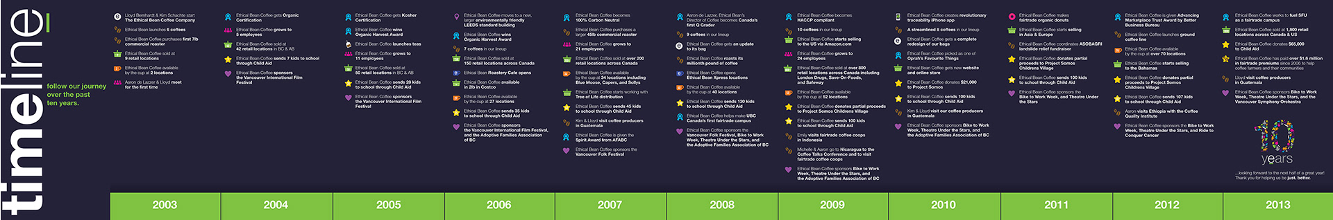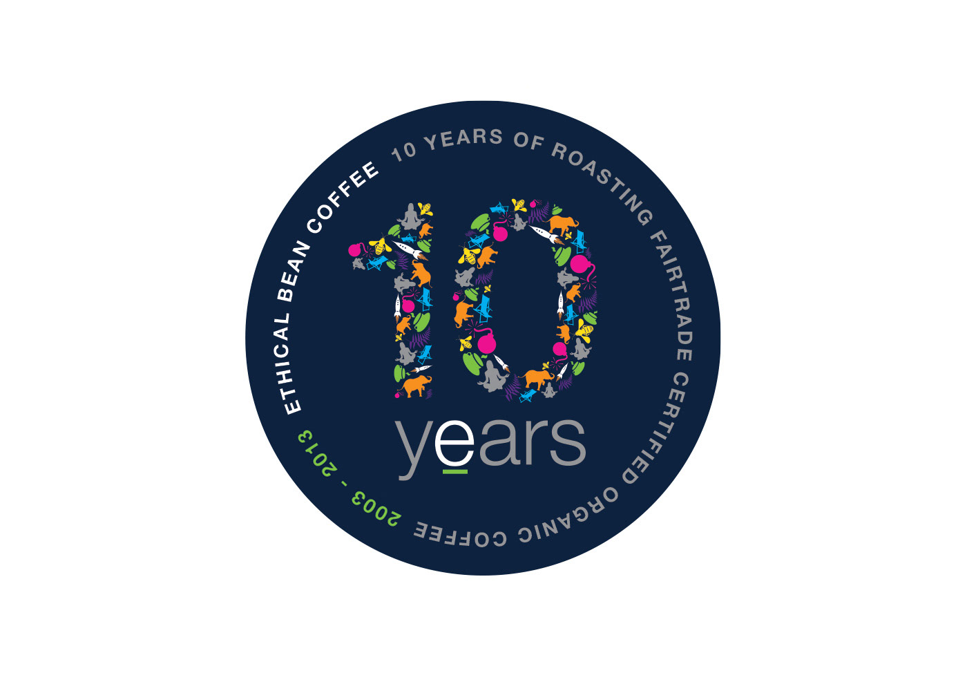Logo to celebrate Ethical Bean Coffee's 10th anniversary. Logo created using the icons and colours from the brands lineup of coffees.